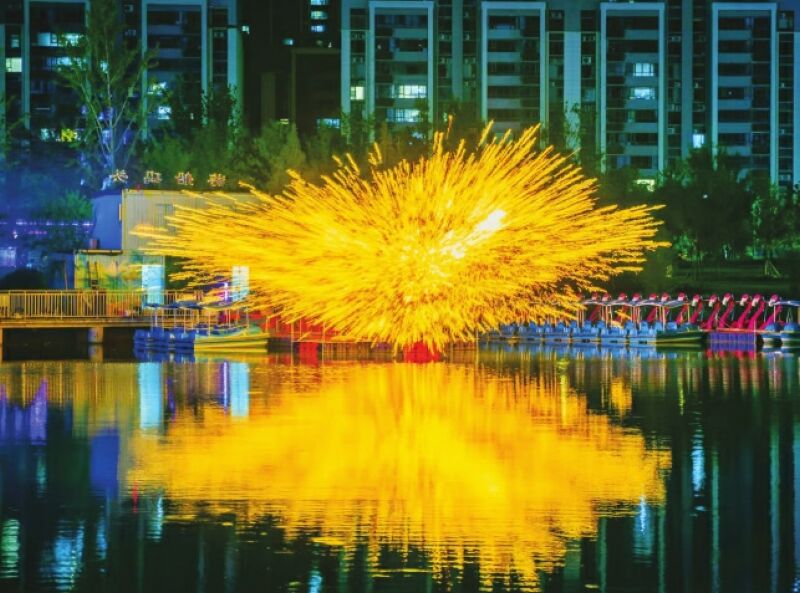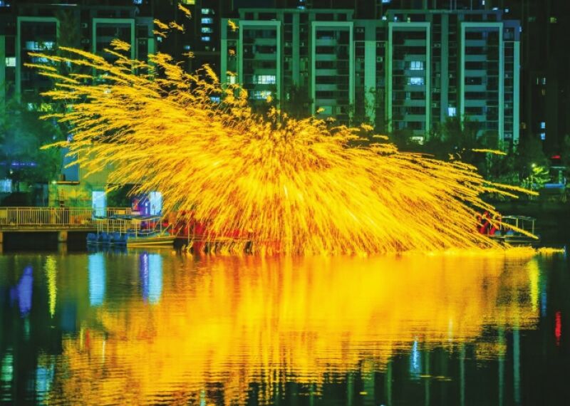 山南兒童公園的夜空因非遺絕技“打鐵花”而被點亮。匠人揮臂潑灑,融化的鐵水瞬間化作億萬流星,與湖中倒影交織成一片金色星海。空中火雨傾瀉,水面流光翩躚,構筑起雙倍璀璨的奇幻宇宙。這場跨越千年的浪漫鐵火之舞,正為夏夜注入最為熾熱的非遺生命力。